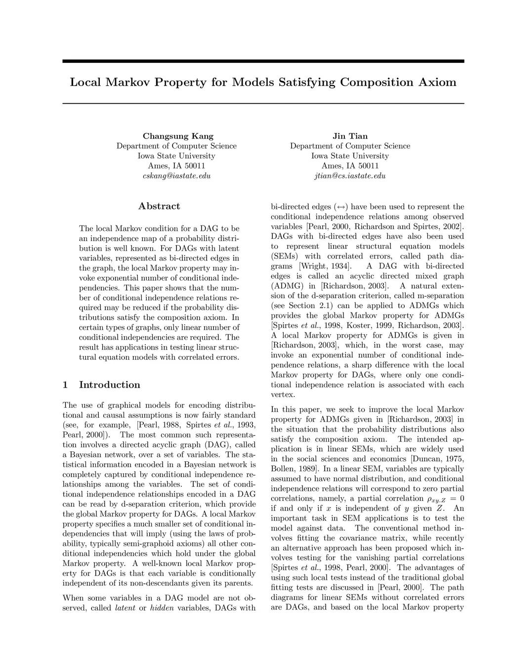 The local Markov condition for a DAG to be an independence map of a probability distribution is well known. For DAGs with latent variables, represented as bi-directed edges in the graph, the local Markov property may invoke exponential number of conditional independencies. This paper shows that the number of conditional independence relations required may be reduced if the probability distributions satisfy the composition axiom. In certain types of graphs, only linear number of conditional independencies are required. The result has applications in testing linear structural equation models with correlated errors.