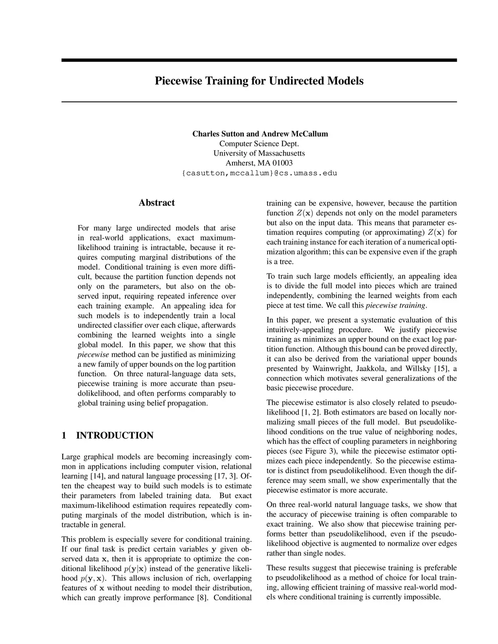 For many large undirected models that arise in real-world applications, exact maximumlikelihood training is intractable, because it requires computing marginal distributions of the model. Conditional training is even more difficult, because the partition function depends not only on the parameters, but also on the observed input, requiring repeated inference over each training example. An appealing idea for such models is to independently train a local undirected classifier over each clique, afterwards combining the learned weights into a single global model. In this paper, we show that this piecewise method can be justified as minimizing a new family of upper bounds on the log partition function. On three natural-language data sets, piecewise training is more accurate than pseudolikelihood, and often performs comparably to global training using belief propagation.