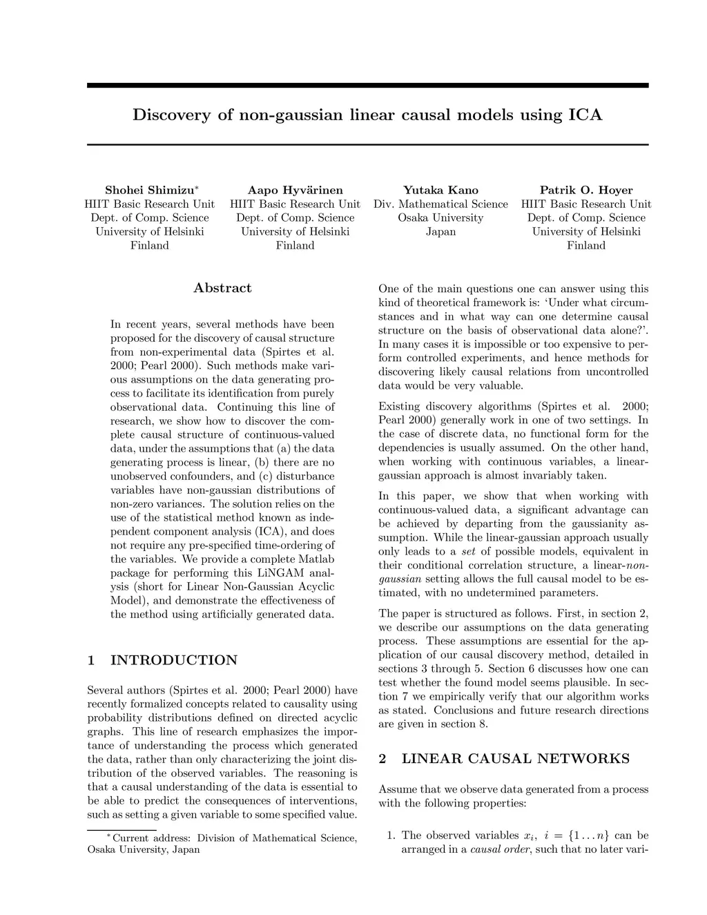 Discovery of non-gaussian linear causal models using ICA