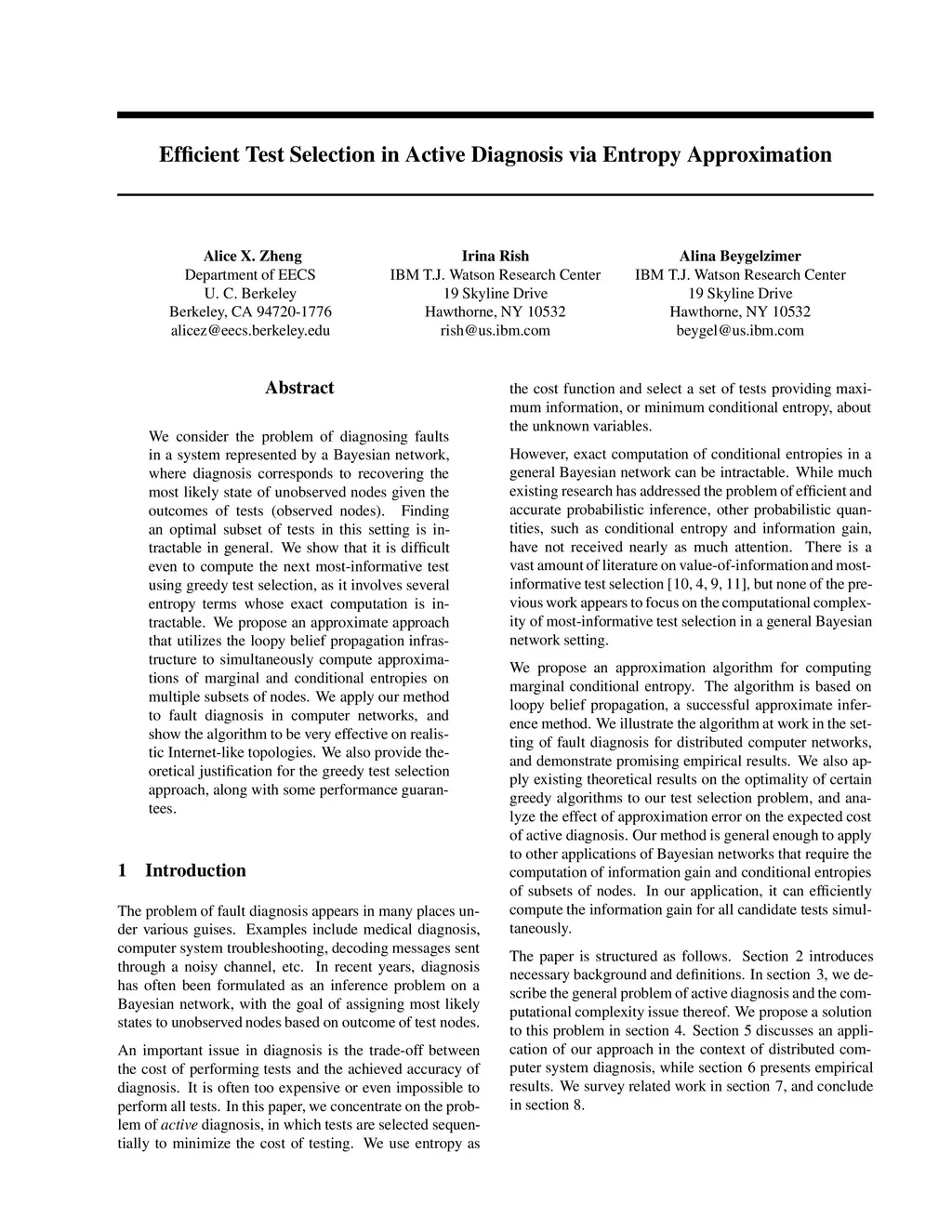 We consider the problem of diagnosing faults in a system represented by a Bayesian network, where diagnosis corresponds to recovering the most likely state of unobserved nodes given the outcomes of tests (observed nodes). Finding an optimal subset of tests in this setting is intractable in general. We show that it is difficult even to compute the next most-informative test using greedy test selection, as it involves several entropy terms whose exact computation is intractable. We propose an approximate approach that utilizes the loopy belief propagation infrastructure to simultaneously compute approximations of marginal and conditional entropies on multiple subsets of nodes. We apply our method to fault diagnosis in computer networks, and show the algorithm to be very effective on realistic Internet-like topologies. We also provide theoretical justification for the greedy test selection approach, along with some performance guarantees.