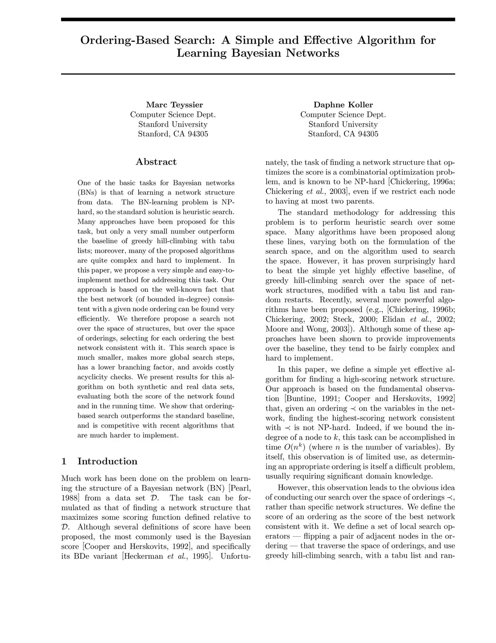 One of the basic tasks for Bayesian networks (BNs) is that of learning a network structure from data. The BN-learning problem is NP-hard, so the standard solution is heuristic search. Many approaches have been proposed for this task, but only a very small number outperform the baseline of greedy hill-climbing with tabu lists; moreover, many of the proposed algorithms are quite complex and hard to implement. In this paper, we propose a very simple and easy-to-implement method for addressing this task. Our approach is based on the well-known fact that the best network (of bounded in-degree) consistent with a given node ordering can be found very efficiently. We therefore propose a search not over the space of structures, but over the space of orderings, selecting for each ordering the best network consistent with it. This search space is much smaller, makes more global search steps, has a lower branching factor, and avoids costly acyclicity checks. We present results for this algorithm on both synthetic and real data sets, evaluating both the score of the network found and in the running time. We show that ordering-based search outperforms the standard baseline, and is competitive with recent algorithms that are much harder to implement.