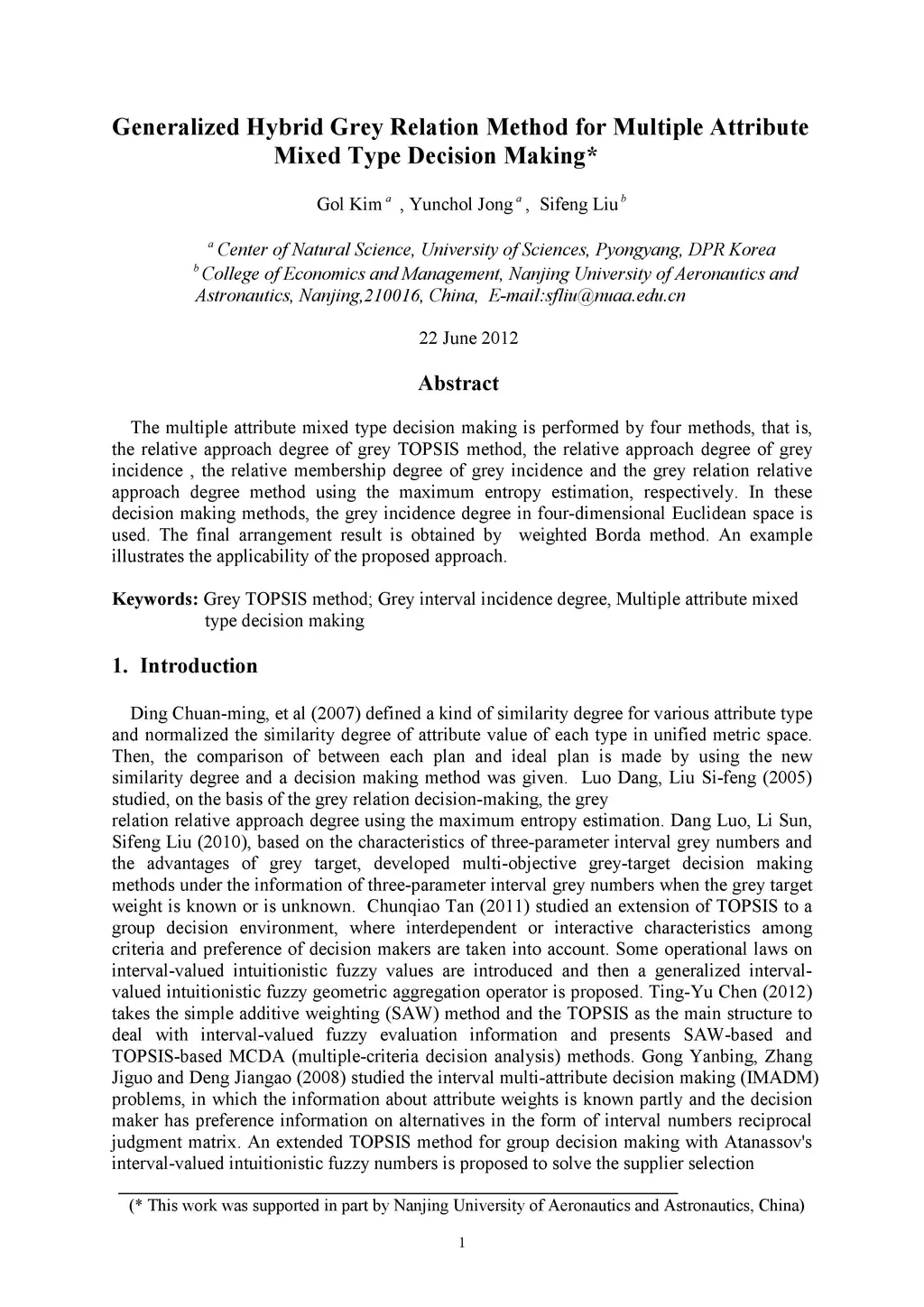 Generalized Hybrid Grey Relation Method for Multiple Attribute Mixed