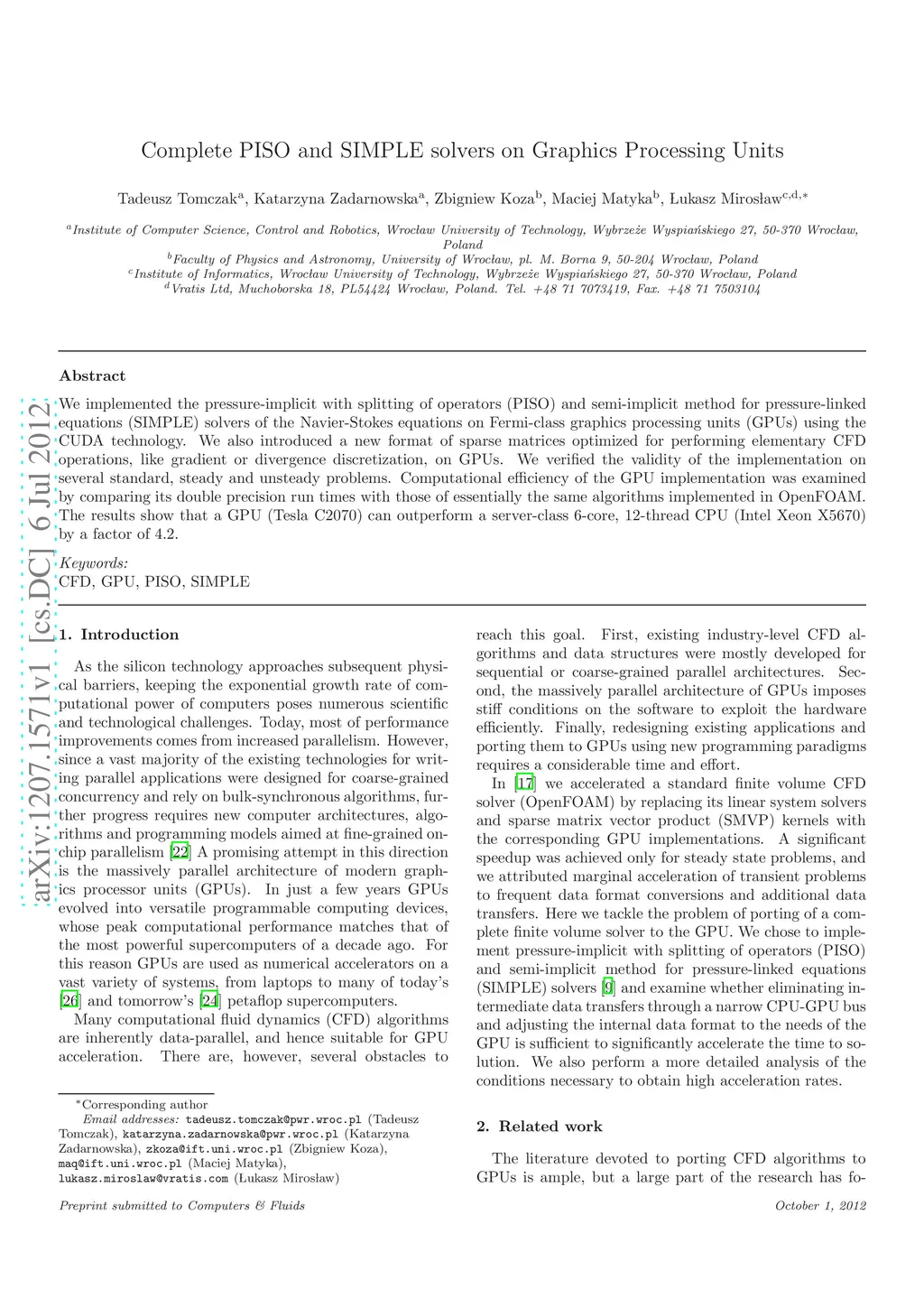 Complete PISO and SIMPLE solvers on Graphics Processing Units