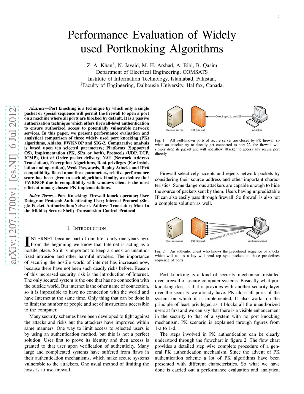 Port knocking is a technique by which only a single packet or special sequence will permit the firewall to open a port on a machine where all ports are blocked by default. It is a passive authorization technique which offers firewall-level authentication to ensure authorized access to potentially vulnerable network services. In this paper, we present performance evaluation and analytical comparison of three widely used port knocking (PK) algorithms, Aldaba, FWKNOP and SIG-2. Comparative analysis is based upon ten selected parameters; Platforms (Supported OS), Implementation (PK, SPA or both), Protocols (UDP, TCP, ICMP), Out of Order packet delivery, NAT (Network Address Translation), Encryption Algorithms, Root privileges (For installation and operation), Weak Passwords, Replay Attacks and IPv6 compatibility. Based upon these parameters, relative performance score has been given to each algorithm. Finally, we deduce that FWKNOP due to compatibility with windows client is the most efficient among chosen PK implementations.