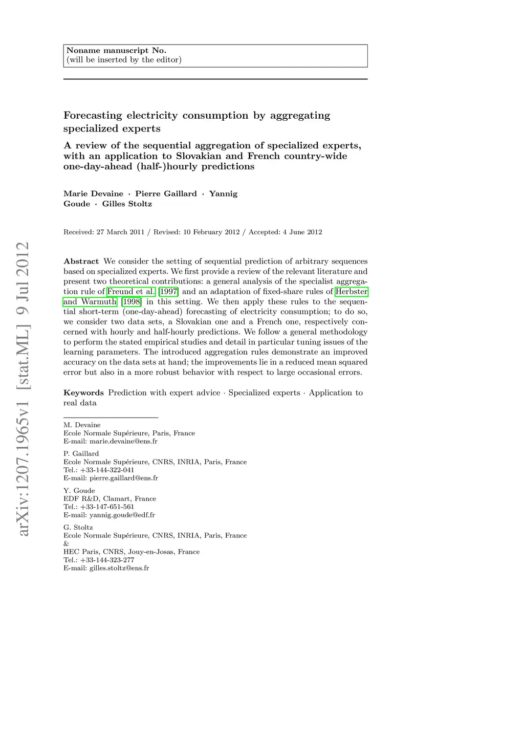 We consider the setting of sequential prediction of arbitrary sequences based on specialized experts. We first provide a review of the relevant literature and present two theoretical contributions: a general analysis of the specialist aggregation rule of Freund et al. (1997) and an adaptation of fixed-share rules of Herbster and Warmuth (1998) in this setting. We then apply these rules to the sequential short-term (one-day-ahead) forecasting of electricity consumption; to do so, we consider two data sets, a Slovakian one and a French one, respectively concerned with hourly and half-hourly predictions. We follow a general methodology to perform the stated empirical studies and detail in particular tuning issues of the learning parameters. The introduced aggregation rules demonstrate an improved accuracy on the data sets at hand; the improvements lie in a reduced mean squared error but also in a more robust behavior with respect to large occasional errors.