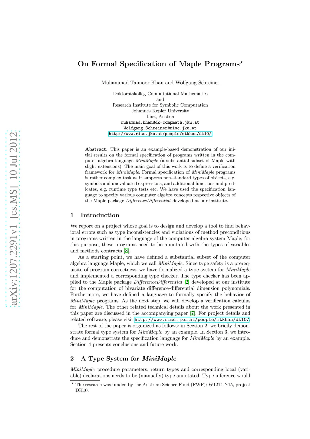 This paper is an example-based demonstration of our initial results on the formal specification of programs written in the computer algebra language MiniMaple (a substantial subset of Maple with slight extensions). The main goal of this work is to define a verification framework for MiniMaple. Formal specification of MiniMaple programs is rather complex task as it supports non-standard types of objects, e.g. symbols and unevaluated expressions, and additional functions and predicates, e.g. runtime type tests etc. We have used the specification language to specify various computer algebra concepts respective objects of the Maple package DifferenceDifferential developed at our institute.