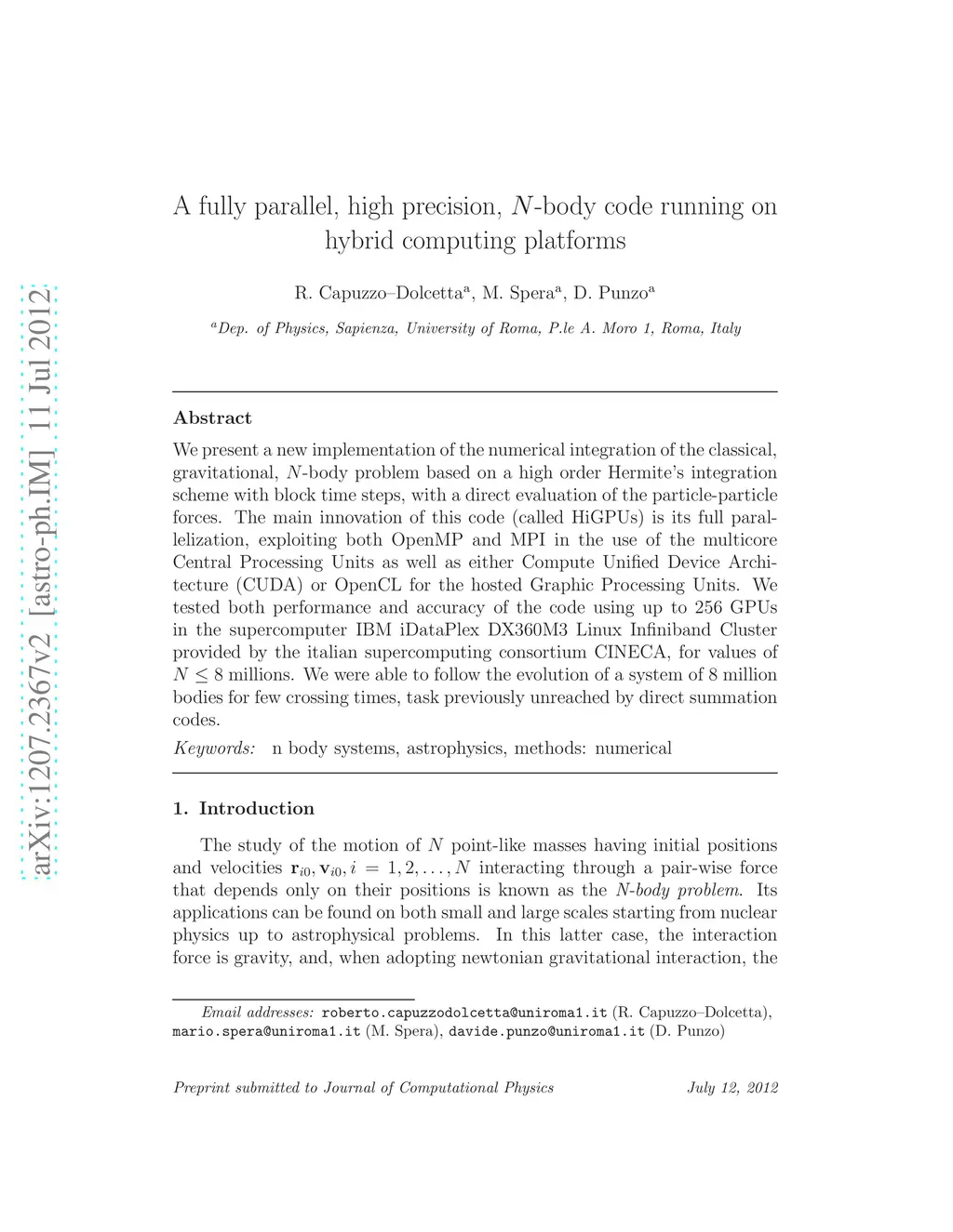 We present a new implementation of the numerical integration of the classical, gravitational, N-body problem based on a high order Hermite's integration scheme with block time steps, with a direct evaluation of the particle-particle forces. The main innovation of this code (called HiGPUs) is its full parallelization, exploiting both OpenMP and MPI in the use of the multicore Central Processing Units as well as either Compute Unified Device Architecture (CUDA) or OpenCL for the hosted Graphic Processing Units. We tested both performance and accuracy of the code using up to 256 GPUs in the supercomputer IBM iDataPlex DX360M3 Linux Infiniband Cluster provided by the italian supercomputing consortium CINECA, for values of N up to 8 millions. We were able to follow the evolution of a system of 8 million bodies for few crossing times, task previously unreached by direct summation codes. The code is freely available to the scientific community.