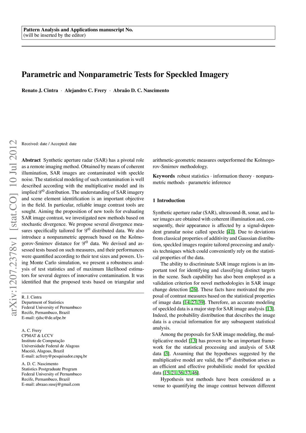 Synthetic aperture radar (SAR) has a pivotal role as a remote imaging method. Obtained by means of coherent illumination, SAR images are contaminated with speckle noise. The statistical modeling of such contamination is well described according with the multiplicative model and its implied G0 distribution. The understanding of SAR imagery and scene element identification is an important objective in the field. In particular, reliable image contrast tools are sought. Aiming the proposition of new tools for evaluating SAR image contrast, we investigated new methods based on stochastic divergence. We propose several divergence measures specifically tailored for G0 distributed data. We also introduce a nonparametric approach based on the Kolmogorov-Smirnov distance for G0 data. We devised and assessed tests based on such measures, and their performances were quantified according to their test sizes and powers. Using Monte Carlo simulation, we present a robustness analysis of test statistics and of maximum likelihood estimators for several degrees of innovative contamination. It was identified that the proposed tests based on triangular and arithmetic-geometric measures outperformed the Kolmogorov-Smirnov methodology.