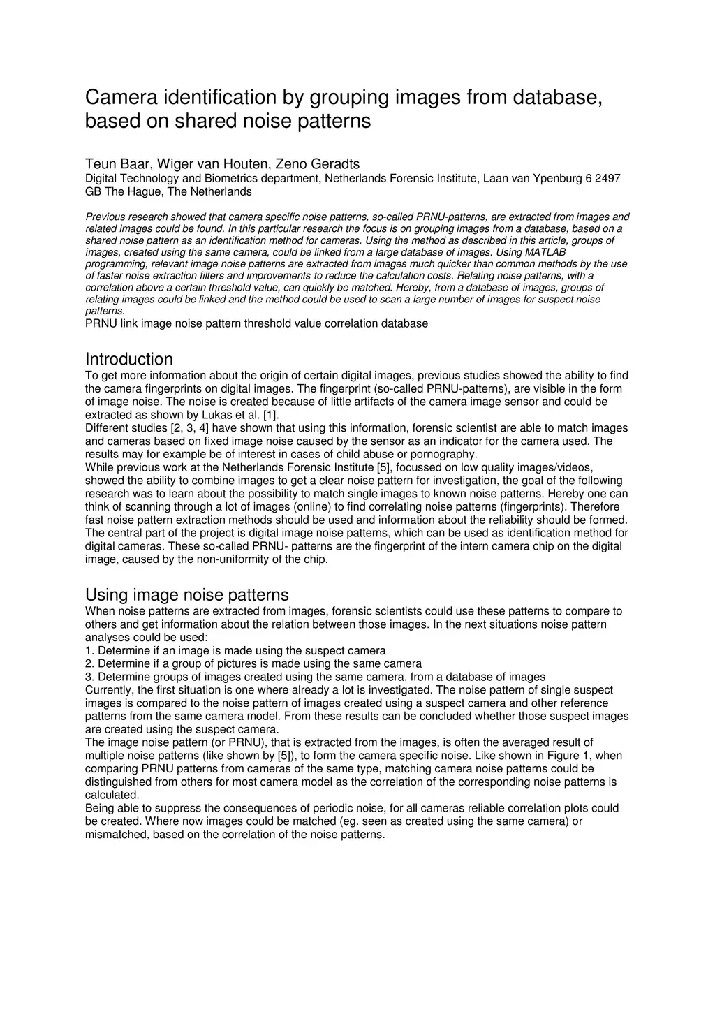 Previous research showed that camera specific noise patterns, so-called PRNU-patterns, are extracted from images and related images could be found. In this particular research the focus is on grouping images from a database, based on a shared noise pattern as an identification method for cameras. Using the method as described in this article, groups of images, created using the same camera, could be linked from a large database of images. Using MATLAB programming, relevant image noise patterns are extracted from images much quicker than common methods by the use of faster noise extraction filters and improvements to reduce the calculation costs. Relating noise patterns, with a correlation above a certain threshold value, can quickly be matched. Hereby, from a database of images, groups of relating images could be linked and the method could be used to scan a large number of images for suspect noise patterns.