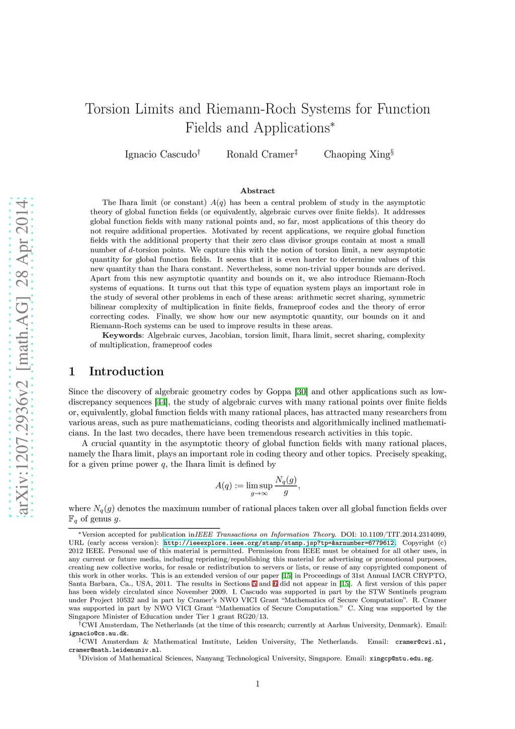 The Ihara limit (or -constant) has been a central problem of study in the asymptotic theory of global function fields (or equivalently, algebraic curves over finite fields). It addresses global function fields with many rational points and, so far, most applications of this theory do not require additional properties. Motivated by recent applications, we require global function fields with the additional property that their zero class divisor groups contain at most a small number of -torsion points. We capture this by the torsion limit, a new asymptotic quantity for global function fields. It seems that it is even harder to determine values of this new quantity than the Ihara constant. Nevertheless, some non-trivial lower- and upper bounds are derived. Apart from this new asymptotic quantity and bounds on it, we also introduce Riemann-Roch systems of equations. It turns out that this type of equation system plays an important role in the study of several other problems in areas such as coding theory, arithmetic secret sharing and multiplication complexity of finite fields etc. Finally, we show how our new asymptotic quantity, our bounds on it and Riemann-Roch systems can be used to improve results in these areas.
