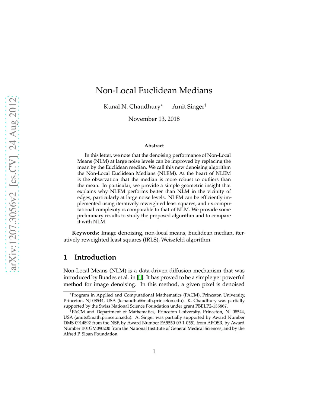 In this letter, we note that the denoising performance of Non-Local Means (NLM) at large noise levels can be improved by replacing the mean by the Euclidean median. We call this new denoising algorithm the Non-Local Euclidean Medians (NLEM). At the heart of NLEM is the observation that the median is more robust to outliers than the mean. In particular, we provide a simple geometric insight that explains why NLEM performs better than NLM in the vicinity of edges, particularly at large noise levels. NLEM can be efficiently implemented using iteratively reweighted least squares, and its computational complexity is comparable to that of NLM. We provide some preliminary results to study the proposed algorithm and to compare it with NLM.