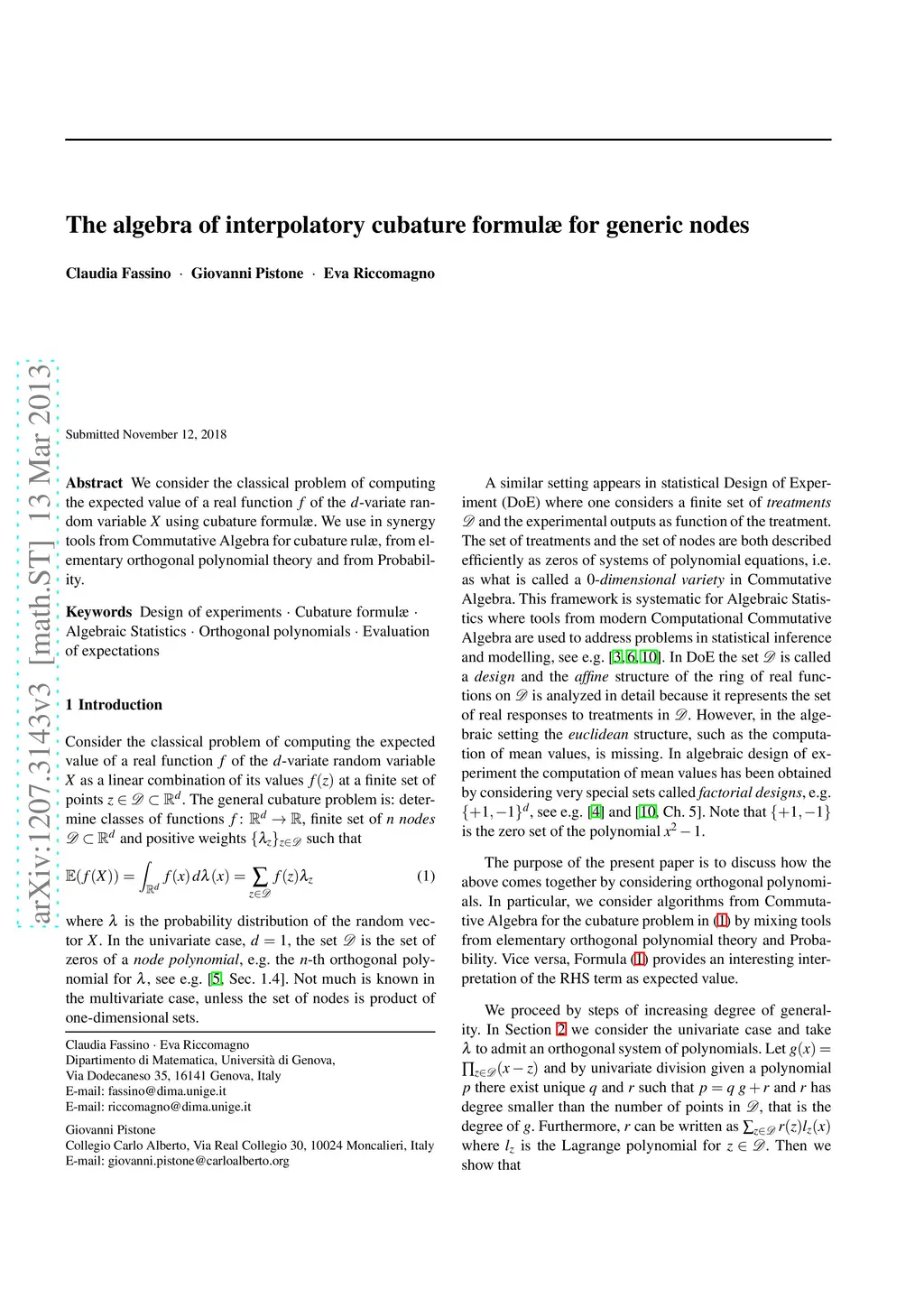 We consider the classical problem of computing the expected value of a real function of the -variate random variable using cubature formul\ae. We use in synergy tools from Commutative Algebra for cubature rul\ae, from elementary orthogonal polynomial theory and from Probability.