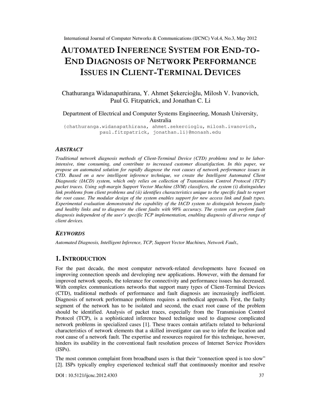 Traditional network diagnosis methods of Client-Terminal Device (CTD) problems tend to be laborintensive, time consuming, and contribute to increased customer dissatisfaction. In this paper, we propose an automated solution for rapidly diagnose the root causes of network performance issues in CTD. Based on a new intelligent inference technique, we create the Intelligent Automated Client Diagnostic (IACD) system, which only relies on collection of Transmission Control Protocol (TCP) packet traces. Using soft-margin Support Vector Machine (SVM) classifiers, the system (i) distinguishes link problems from client problems and (ii) identifies characteristics unique to the specific fault to report the root cause. The modular design of the system enables support for new access link and fault types. Experimental evaluation demonstrated the capability of the IACD system to distinguish between faulty and healthy links and to diagnose the client faults with 98% accuracy. The system can perform fault diagnosis independent of the user's specific TCP implementation, enabling diagnosis of diverse range of client devices