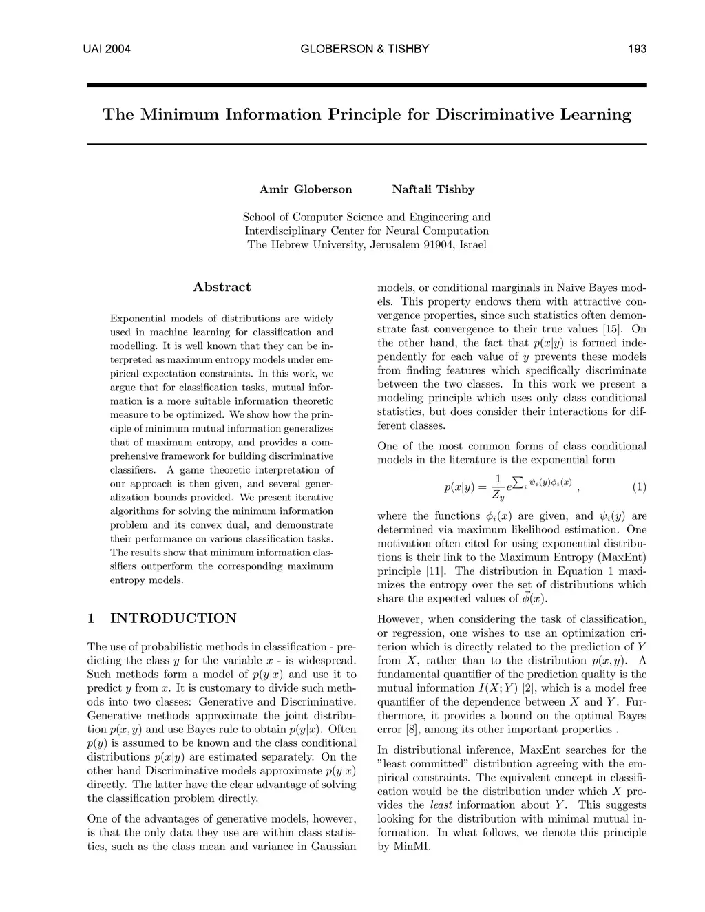 Exponential models of distributions are widely used in machine learning for classiffication and modelling. It is well known that they can be interpreted as maximum entropy models under empirical expectation constraints. In this work, we argue that for classiffication tasks, mutual information is a more suitable information theoretic measure to be optimized. We show how the principle of minimum mutual information generalizes that of maximum entropy, and provides a comprehensive framework for building discriminative classiffiers. A game theoretic interpretation of our approach is then given, and several generalization bounds provided. We present iterative algorithms for solving the minimum information problem and its convex dual, and demonstrate their performance on various classiffication tasks. The results show that minimum information classiffiers outperform the corresponding maximum entropy models.