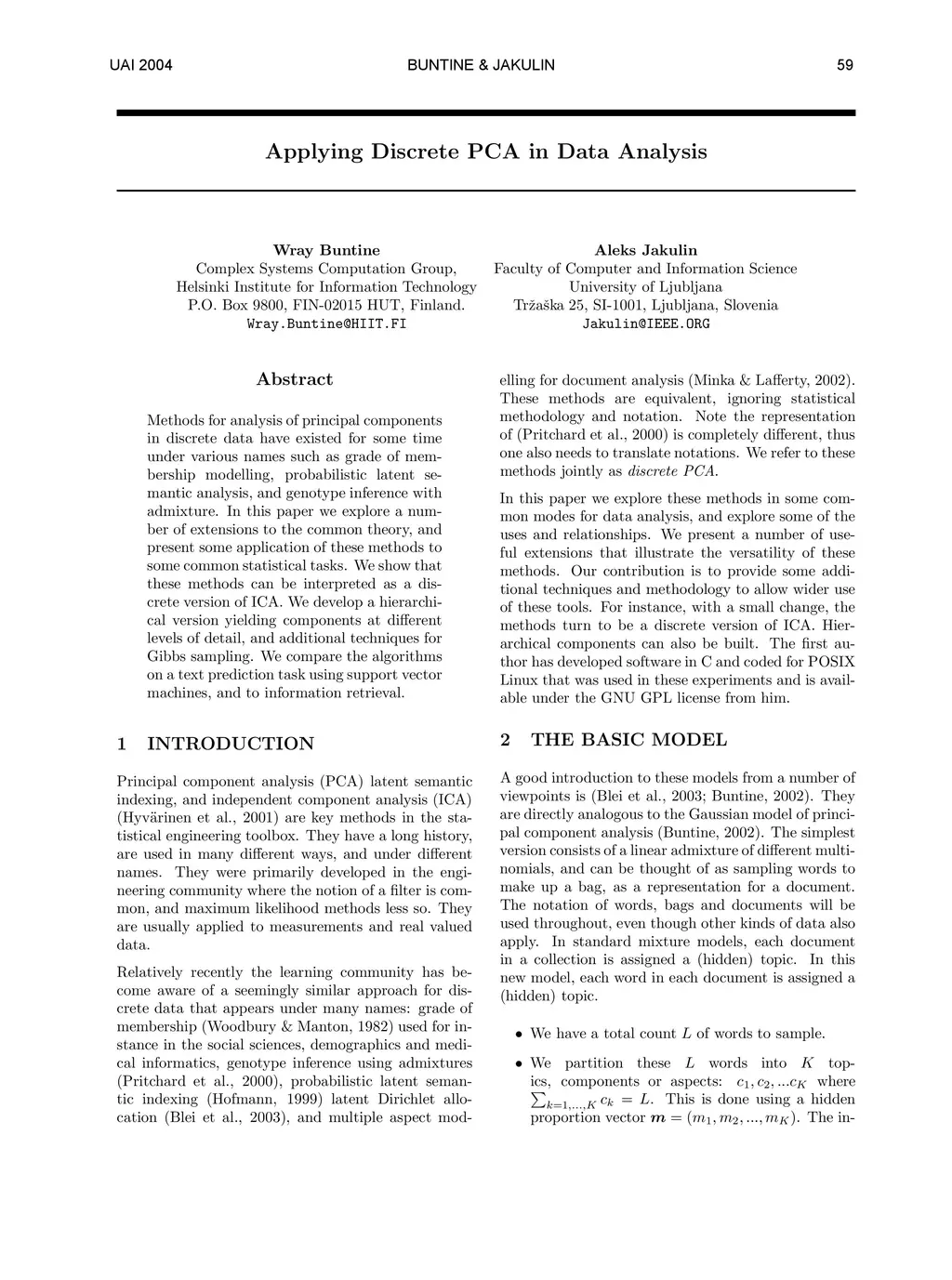 Methods for analysis of principal components in discrete data have existed for some time under various names such as grade of membership modelling, probabilistic latent semantic analysis, and genotype inference with admixture. In this paper we explore a number of extensions to the common theory, and present some application of these methods to some common statistical tasks. We show that these methods can be interpreted as a discrete version of ICA. We develop a hierarchical version yielding components at different levels of detail, and additional techniques for Gibbs sampling. We compare the algorithms on a text prediction task using support vector machines, and to information retrieval.