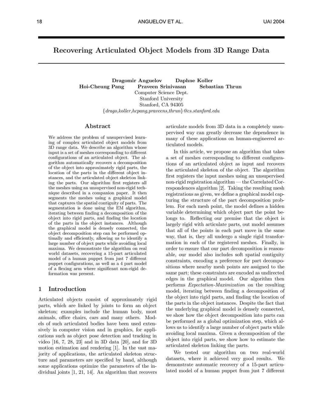 We address the problem of unsupervised learning of complex articulated object models from 3D range data. We describe an algorithm whose input is a set of meshes corresponding to different configurations of an articulated object. The algorithm automatically recovers a decomposition of the object into approximately rigid parts, the location of the parts in the different object instances, and the articulated object skeleton linking the parts. Our algorithm first registers allthe meshes using an unsupervised non-rigid technique described in a companion paper. It then segments the meshes using a graphical model that captures the spatial contiguity of parts. The segmentation is done using the EM algorithm, iterating between finding a decomposition of the object into rigid parts, and finding the location of the parts in the object instances. Although the graphical model is densely connected, the object decomposition step can be performed optimally and efficiently, allowing us to identify a large number of object parts while avoiding local maxima. We demonstrate the algorithm on real world datasets, recovering a 15-part articulated model of a human puppet from just 7 different puppet configurations, as well as a 4 part model of a fiexing arm where significant non-rigid deformation was present.