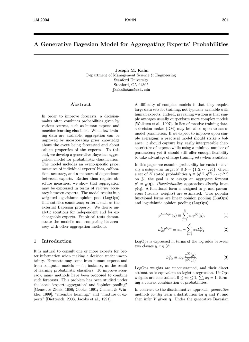 In order to improve forecasts, a decisionmaker often combines probabilities given by various sources, such as human experts and machine learning classifiers. When few training data are available, aggregation can be improved by incorporating prior knowledge about the event being forecasted and about salient properties of the experts. To this end, we develop a generative Bayesian aggregation model for probabilistic classi cation. The model includes an event-specific prior, measures of individual experts' bias, calibration, accuracy, and a measure of dependence betweeen experts. Rather than require absolute measures, we show that aggregation may be expressed in terms of relative accuracy between experts. The model results in a weighted logarithmic opinion pool (LogOps) that satis es consistency criteria such as the external Bayesian property. We derive analytic solutions for independent and for exchangeable experts. Empirical tests demonstrate the model's use, comparing its accuracy with other aggregation methods.