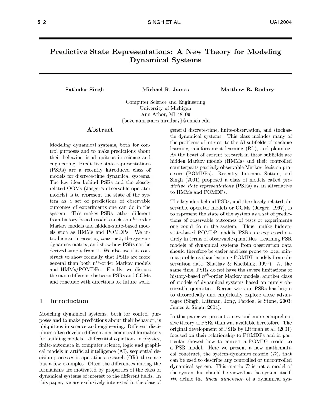 Predictive State Representations: A New Theory for Modeling Dynamical