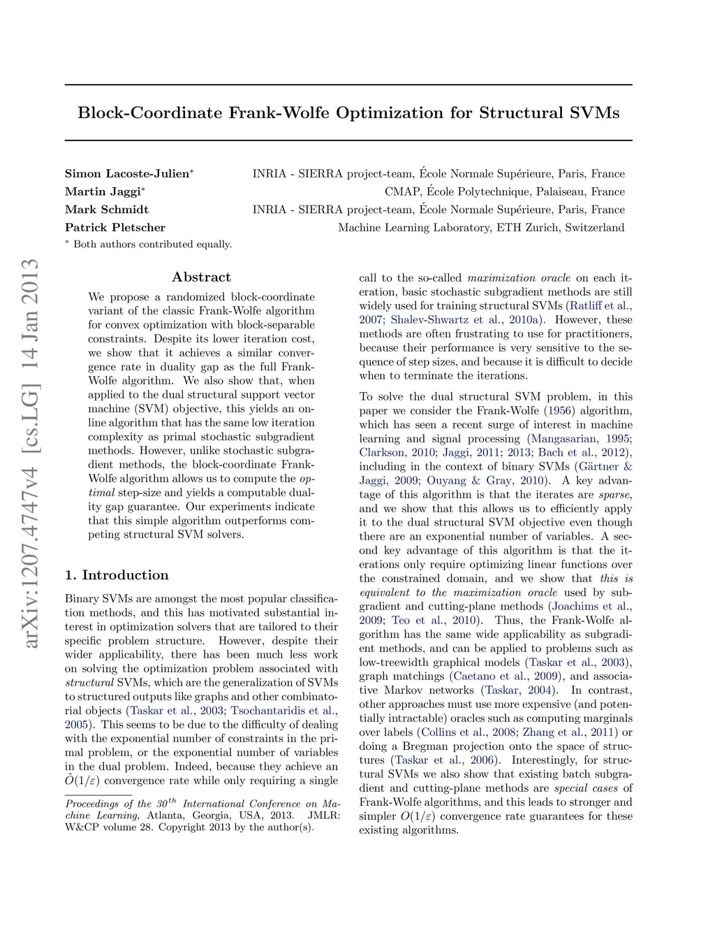 We propose a randomized block-coordinate variant of the classic Frank-Wolfe algorithm for convex optimization with block-separable constraints. Despite its lower iteration cost, we show that it achieves a similar convergence rate in duality gap as the full Frank-Wolfe algorithm. We also show that, when applied to the dual structural support vector machine (SVM) objective, this yields an online algorithm that has the same low iteration complexity as primal stochastic subgradient methods. However, unlike stochastic subgradient methods, the block-coordinate Frank-Wolfe algorithm allows us to compute the optimal step-size and yields a computable duality gap guarantee. Our experiments indicate that this simple algorithm outperforms competing structural SVM solvers.