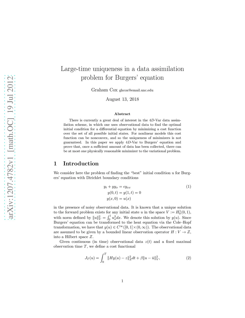 There is currently a great deal of interest in the 4D-Var data assimilation scheme, in which one uses observational data to find the optimal initial condition for a differential equation by minimizing a cost function over the set of all possible initial states. For nonlinear models this cost function can be nonconvex, and so the uniqueness of minimizers is not guaranteed. In this paper we apply 4D-Var to Burgers' equation and prove that, once a sufficient amount of data has been collected, there can be at most one physically reasonable minimizer to the variational problem.