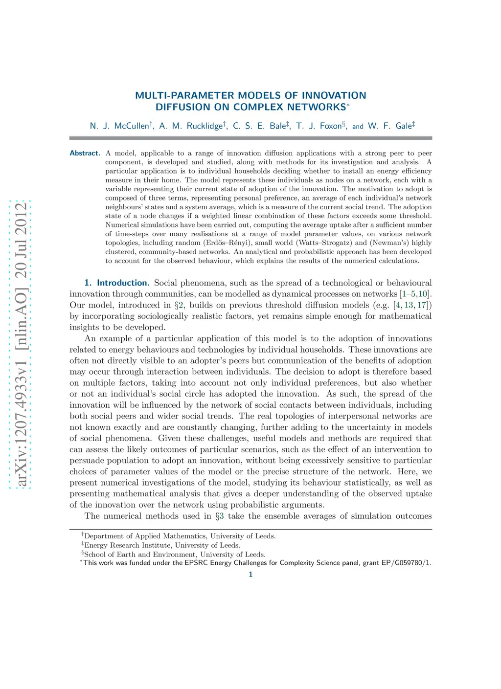 A model, applicable to a range of innovation diffusion applications with a strong peer to peer component, is developed and studied, along with methods for its investigation and analysis. A particular application is to individual households deciding whether to install an energy efficiency measure in their home. The model represents these individuals as nodes on a network, each with a variable representing their current state of adoption of the innovation. The motivation to adopt is composed of three terms, representing personal preference, an average of each individual's network neighbours' states and a system average, which is a measure of the current social trend. The adoption state of a node changes if a weighted linear combination of these factors exceeds some threshold. Numerical simulations have been carried out, computing the average uptake after a sufficient number of time-steps over many realisations at a range of model parameter values, on various network topologies, including random (Erdos-Renyi), small world (Watts-Strogatz) and (Newman's) highly clustered, community-based networks. An analytical and probabilistic approach has been developed to account for the observed behaviour, which explains the results of the numerical calculations.