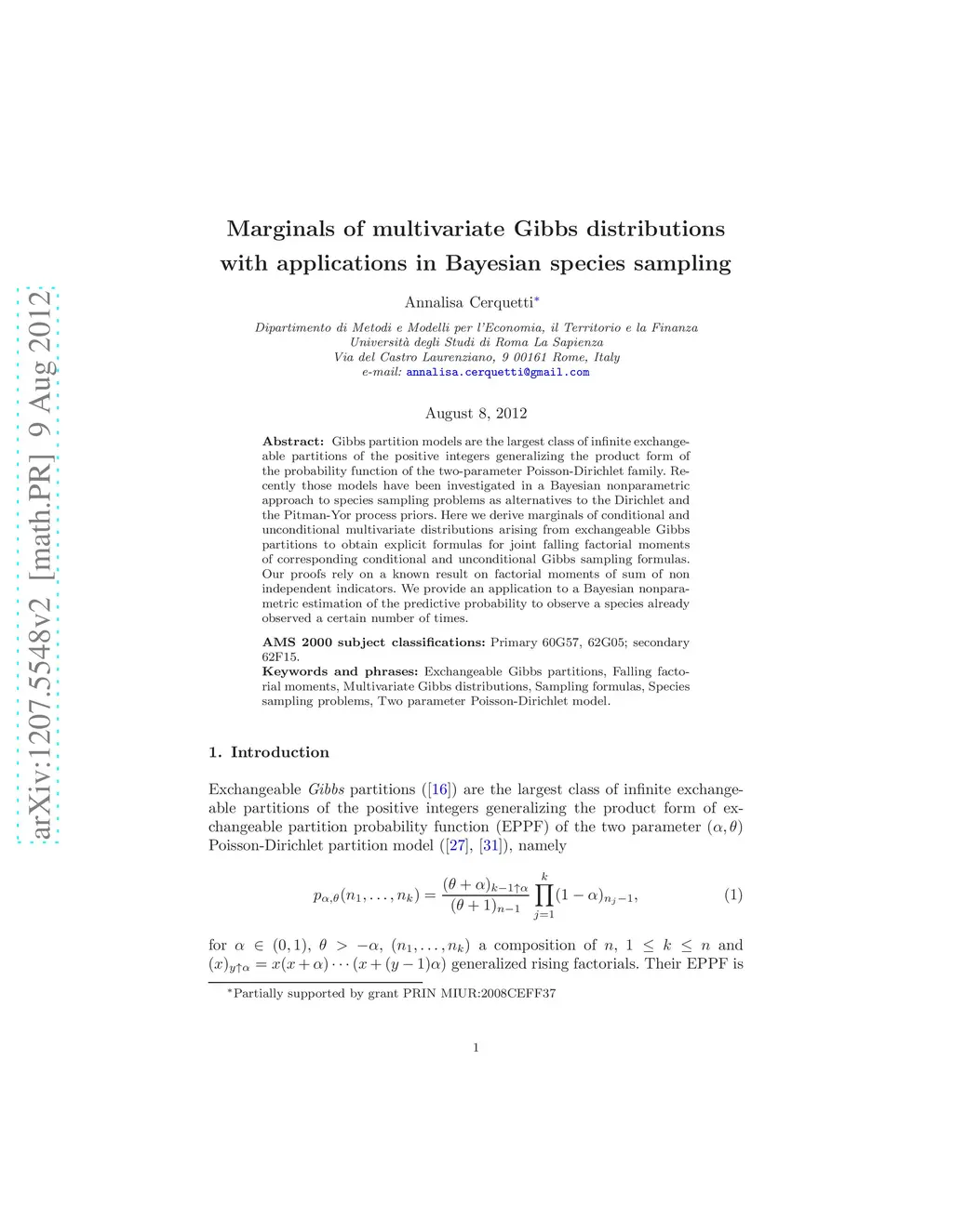 Gibbs partition models are the largest class of infinite exchangeable partitions of the positive integers generalizing the product form of the probability function of the two-parameter Poisson-Dirichlet family. Recently those models have been investigated in a Bayesian nonparametric approach to species sampling problems as alternatives to the Dirichlet and the Pitman-Yor process priors. Here we derive marginals of conditional and unconditional multivariate distributions arising from exchangeable Gibbs partitions to obtain explicit formulas for joint falling factorial moments of corresponding conditional and unconditional Gibbs sampling formulas. Our proofs rely on a known result on factorial moments of sum of non independent indicators. We provide an application to a Bayesian nonparametric estimation of the predictive probability to observe a species already observed a certain number of times.