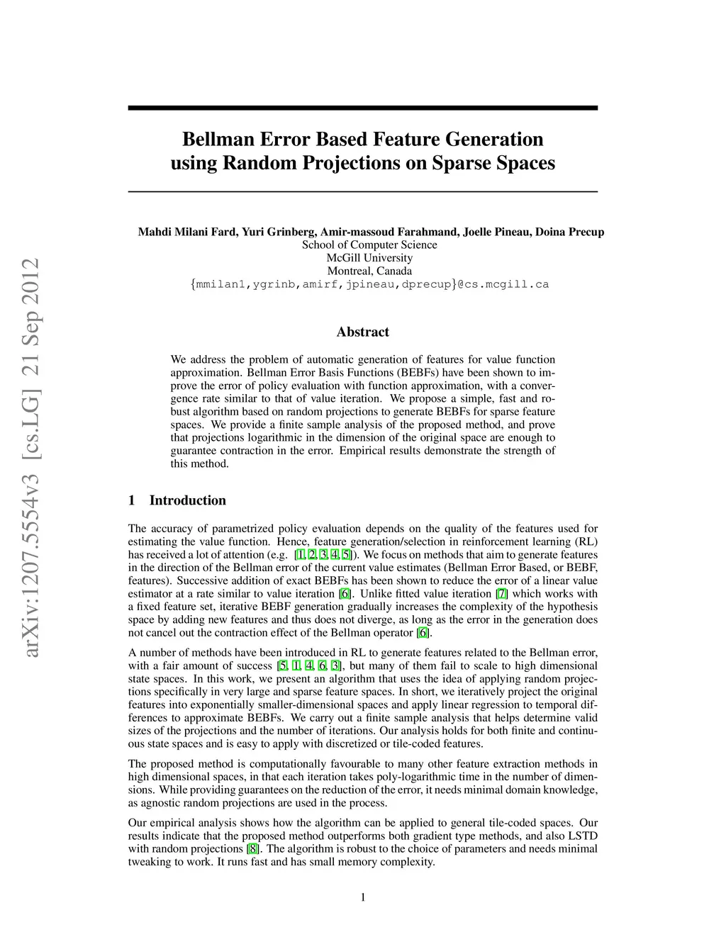We address the problem of automatic generation of features for value function approximation. Bellman Error Basis Functions (BEBFs) have been shown to improve the error of policy evaluation with function approximation, with a convergence rate similar to that of value iteration. We propose a simple, fast and robust algorithm based on random projections to generate BEBFs for sparse feature spaces. We provide a finite sample analysis of the proposed method, and prove that projections logarithmic in the dimension of the original space are enough to guarantee contraction in the error. Empirical results demonstrate the strength of this method.