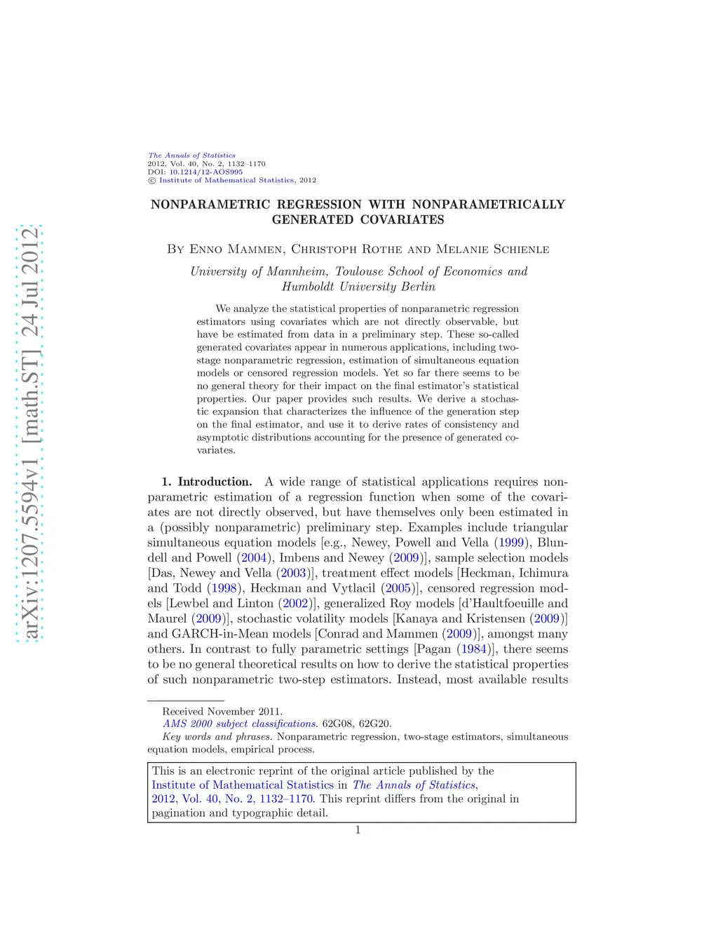 Nonparametric regression with nonparametrically generated covariates