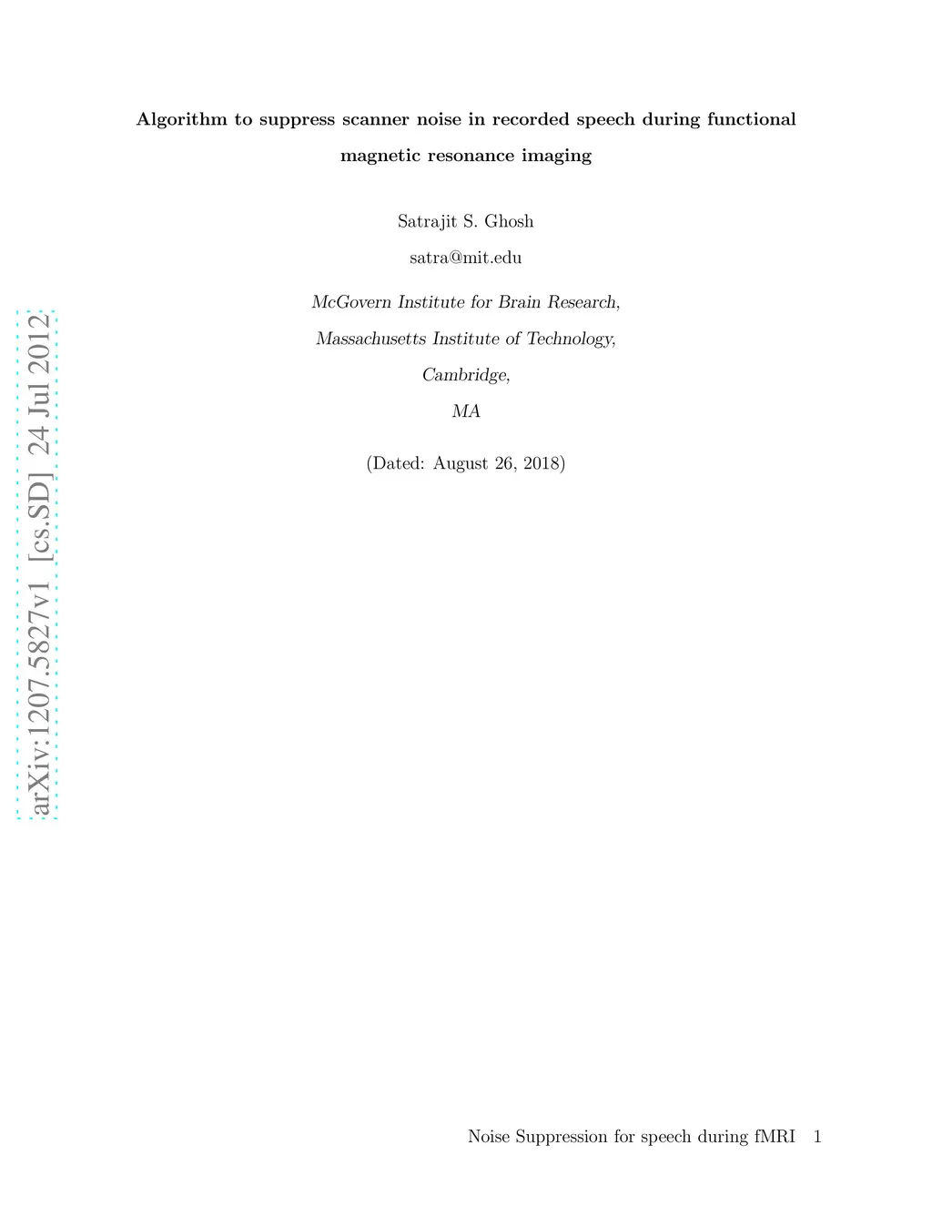 The high-intensity, repetitive noise associated with functional magnetic resonance imaging hinders on-line monitoring of subjects' speech and/or recording speech signals suitable for off-line analysis. The proposed algorithm enhances the speech signal by suppressing the scanner noise in the signal recorded by a single-channel microphone. Significant increases in signal-to-noise ratio are achieved using an adaptive filter that combines time and frequency domain elements. In addition to providing a recording suitable for speech analysis, such a real-time system provides an alternative means (to, e.g., the "panic ball") for communication between the patient and the operator during image acquisition.