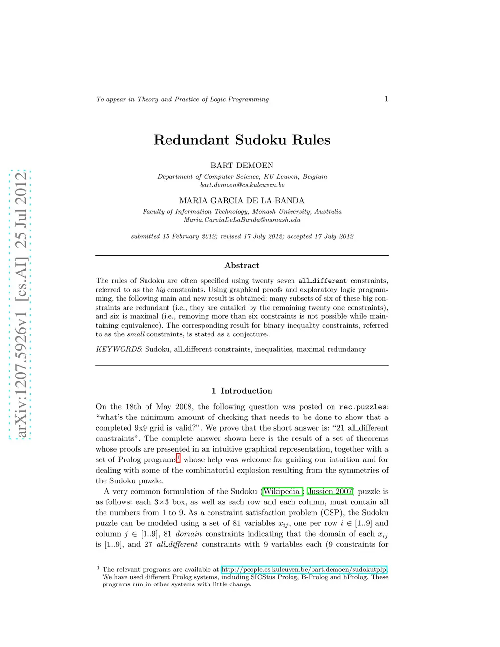 The rules of Sudoku are often specified using twenty seven \texttt{all\_different} constraints, referred to as the {\em big} \mrules. Using graphical proofs and exploratory logic programming, the following main and new result is obtained: many subsets of six of these big \mrules are redundant (i.e., they are entailed by the remaining twenty one \mrules), and six is maximal (i.e., removing more than six \mrules is not possible while maintaining equivalence). The corresponding result for binary inequality constraints, referred to as the {\em small} \mrules, is stated as a conjecture.
