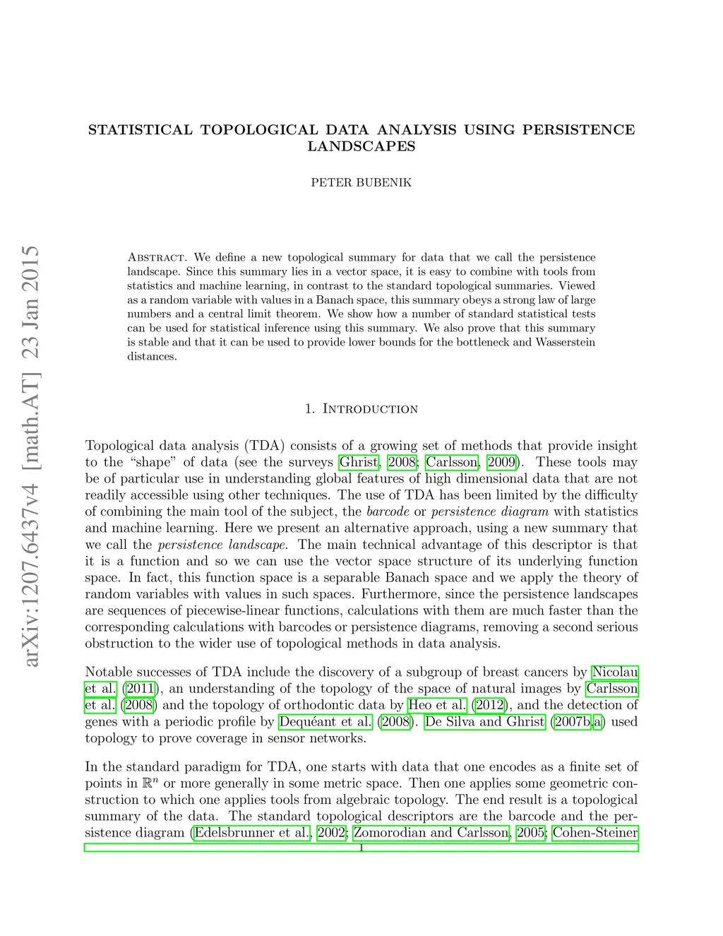 We define a new topological summary for data that we call the persistence landscape. Since this summary lies in a vector space, it is easy to combine with tools from statistics and machine learning, in contrast to the standard topological summaries. Viewed as a random variable with values in a Banach space, this summary obeys a strong law of large numbers and a central limit theorem. We show how a number of standard statistical tests can be used for statistical inference using this summary. We also prove that this summary is stable and that it can be used to provide lower bounds for the bottleneck and Wasserstein distances.