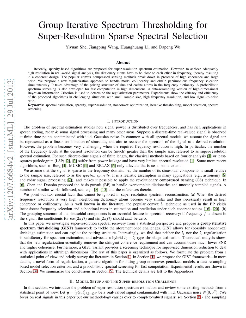 Recently, sparsity-based algorithms are proposed for super-resolution spectrum estimation. However, to achieve adequately high resolution in real-world signal analysis, the dictionary atoms have to be close to each other in frequency, thereby resulting in a coherent design. The popular convex compressed sensing methods break down in presence of high coherence and large noise. We propose a new regularization approach to handle model collinearity and obtain parsimonious frequency selection simultaneously. It takes advantage of the pairing structure of sine and cosine atoms in the frequency dictionary. A probabilistic spectrum screening is also developed for fast computation in high dimensions. A data-resampling version of high-dimensional Bayesian Information Criterion is used to determine the regularization parameters. Experiments show the efficacy and efficiency of the proposed algorithms in challenging situations with small sample size, high frequency resolution, and low signal-to-noise ratio.