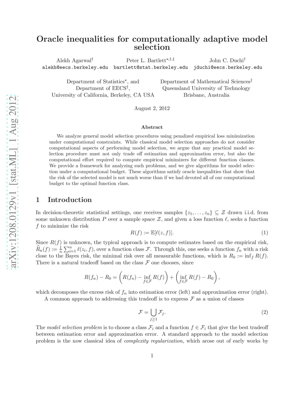 We analyze general model selection procedures using penalized empirical loss minimization under computational constraints. While classical model selection approaches do not consider computational aspects of performing model selection, we argue that any practical model selection procedure must not only trade off estimation and approximation error, but also the computational effort required to compute empirical minimizers for different function classes. We provide a framework for analyzing such problems, and we give algorithms for model selection under a computational budget. These algorithms satisfy oracle inequalities that show that the risk of the selected model is not much worse than if we had devoted all of our omputational budget to the optimal function class.