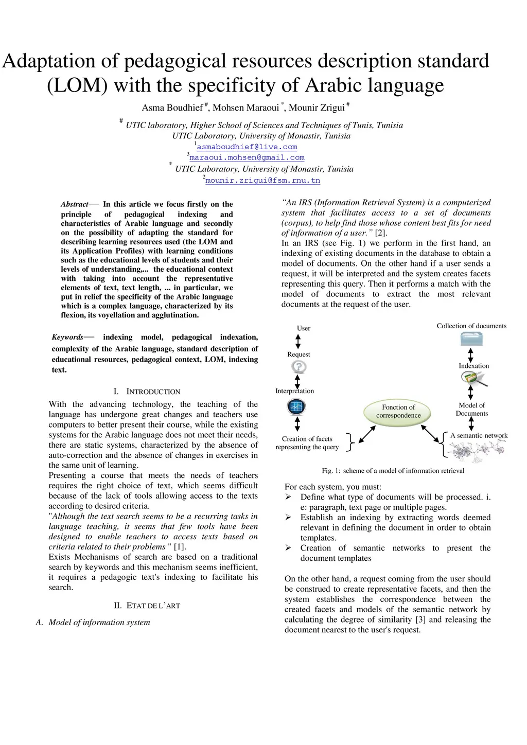 In this article we focus firstly on the principle of pedagogical indexing and characteristics of Arabic language and secondly on the possibility of adapting the standard for describing learning resources used (the LOM and its Application Profiles) with learning conditions such as the educational levels of students and their levels of understanding,... the educational context with taking into account the representative elements of text, text length, ... in particular, we put in relief the specificity of the Arabic language which is a complex language, characterized by its flexion, its voyellation and agglutination.