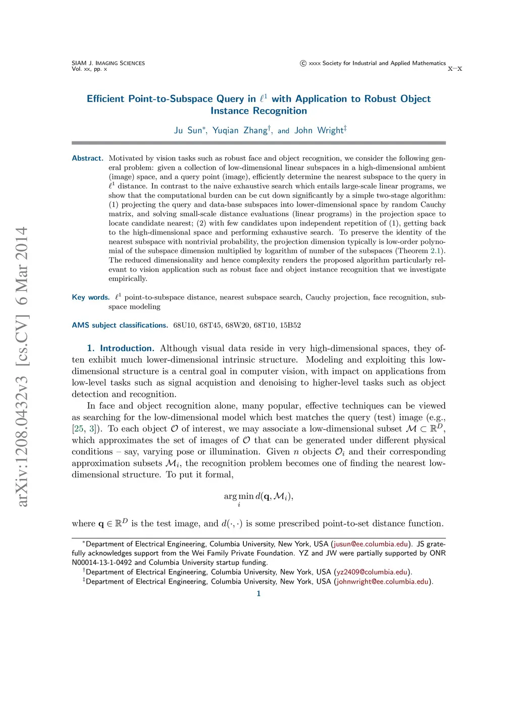 Motivated by vision tasks such as robust face and object recognition, we consider the following general problem: given a collection of low-dimensional linear subspaces in a high-dimensional ambient (image) space, and a query point (image), efficiently determine the nearest subspace to the query in distance. In contrast to the naive exhaustive search which entails large-scale linear programs, we show that the computational burden can be cut down significantly by a simple two-stage algorithm: (1) projecting the query and data-base subspaces into lower-dimensional space by random Cauchy matrix, and solving small-scale distance evaluations (linear programs) in the projection space to locate candidate nearest; (2) with few candidates upon independent repetition of (1), getting back to the high-dimensional space and performing exhaustive search. To preserve the identity of the nearest subspace with nontrivial probability, the projection dimension typically is low-order polynomial of the subspace dimension multiplied by logarithm of number of the subspaces (Theorem 2.1). The reduced dimensionality and hence complexity renders the proposed algorithm particularly relevant to vision application such as robust face and object instance recognition that we investigate empirically.