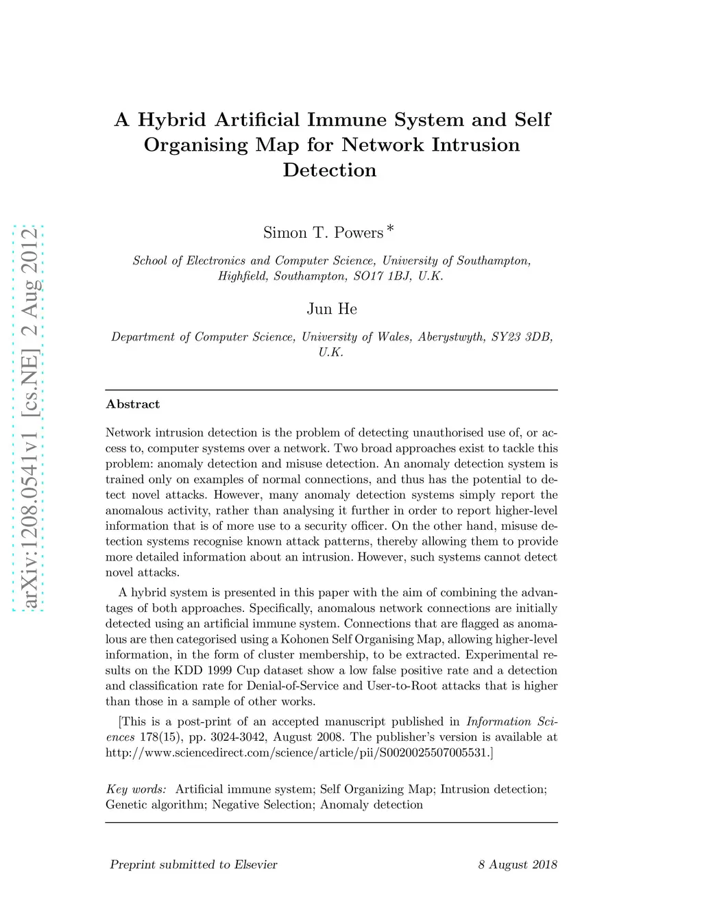 A hybrid artificial immune system and Self Organising Map for network