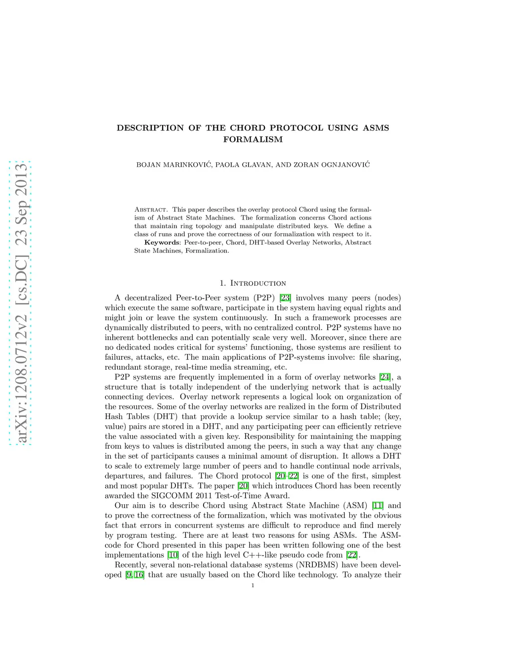 This paper describes the overlay protocol Chord using the formalism of Abstract State Machines. The formalization concerns Chord actions that maintain ring topology and manipulate distributed keys. We define a class of runs and prove the correctness of our formalization with respect to it.