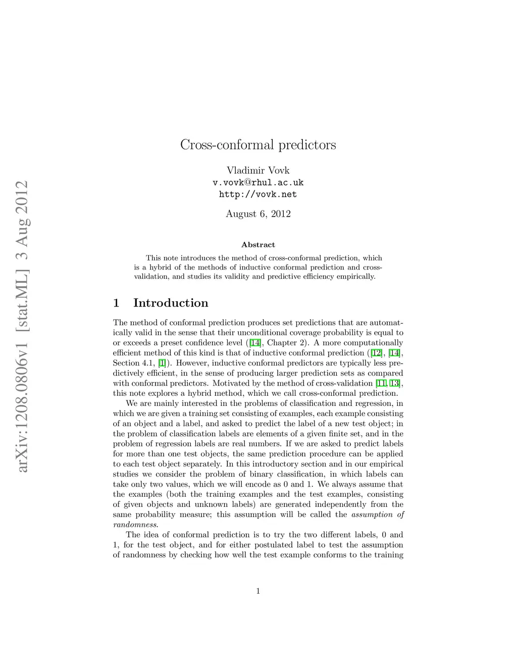 This note introduces the method of cross-conformal prediction, which is a hybrid of the methods of inductive conformal prediction and cross-validation, and studies its validity and predictive efficiency empirically.