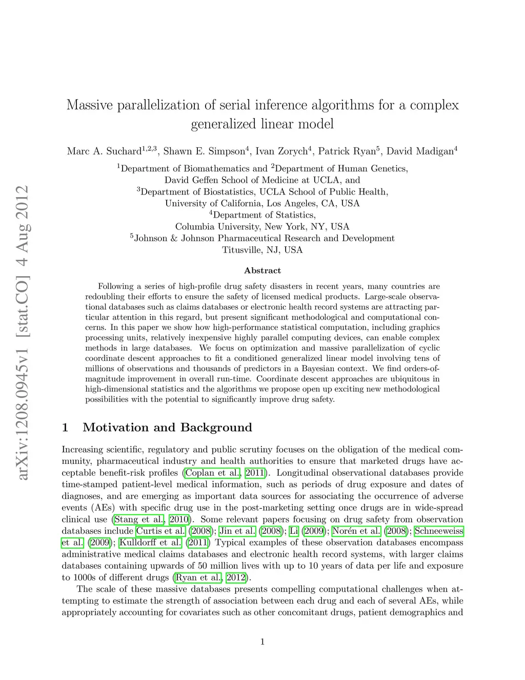 Following a series of high-profile drug safety disasters in recent years, many countries are redoubling their efforts to ensure the safety of licensed medical products. Large-scale observational databases such as claims databases or electronic health record systems are attracting particular attention in this regard, but present significant methodological and computational concerns. In this paper we show how high-performance statistical computation, including graphics processing units, relatively inexpensive highly parallel computing devices, can enable complex methods in large databases. We focus on optimization and massive parallelization of cyclic coordinate descent approaches to fit a conditioned generalized linear model involving tens of millions of observations and thousands of predictors in a Bayesian context. We find orders-of-magnitude improvement in overall run-time. Coordinate descent approaches are ubiquitous in high-dimensional statistics and the algorithms we propose open up exciting new methodological possibilities with the potential to significantly improve drug safety.