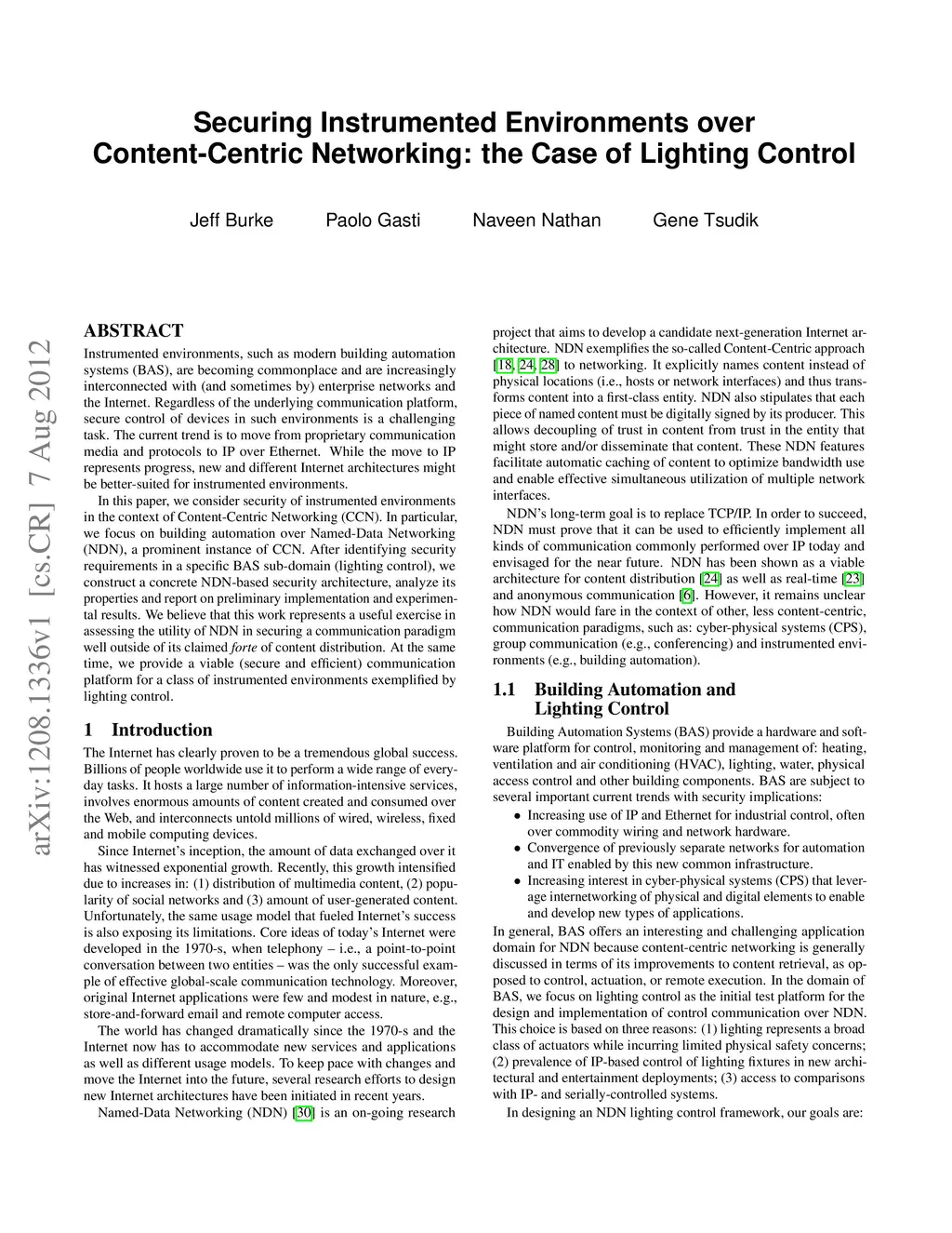 Instrumented environments, such as modern building automation systems (BAS), are becoming commonplace and are increasingly interconnected with (and sometimes by) enterprise networks and the Internet. Regardless of the underlying communication platform, secure control of devices in such environments is a challenging task. The current trend is to move from proprietary communication media and protocols to IP over Ethernet. While the move to IP represents progress, new and different Internet architectures might be better-suited for instrumented environments. In this paper, we consider security of instrumented environments in the context of Content-Centric Networking (CCN). In particular, we focus on building automation over Named-Data Networking (NDN), a prominent instance of CCN. After identifying security requirements in a specific BAS sub-domain (lighting control), we construct a concrete NDN-based security architecture, analyze its properties and report on preliminary implementation and experimental results. We believe in securing a communication paradigm well outside of its claimed forte of content distribution. At the same time, we provide a viable (secure and efficient) communication platform for a class of instrumented environments exemplified by lighting control.
