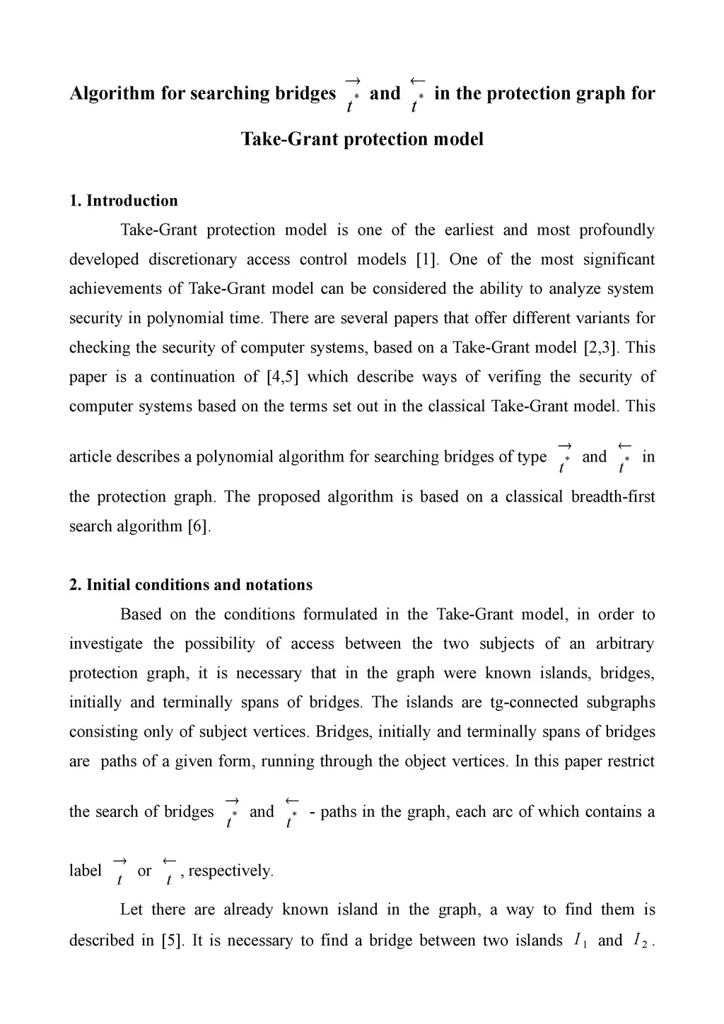The article contains the algorithm for searching a certain kind of bridges in the protection graph of Take-Grant model. The proposed algorithm is based on a classical breadth-first search algorithm.
