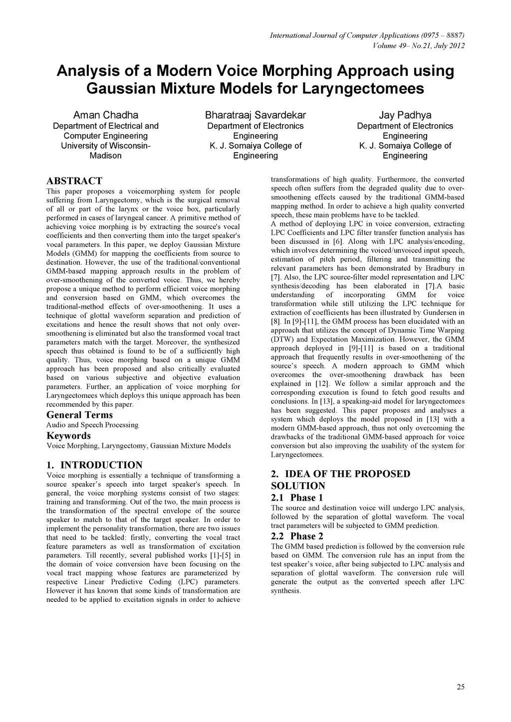 This paper proposes a voice morphing system for people suffering from Laryngectomy, which is the surgical removal of all or part of the larynx or the voice box, particularly performed in cases of laryngeal cancer. A primitive method of achieving voice morphing is by extracting the source's vocal coefficients and then converting them into the target speaker's vocal parameters. In this paper, we deploy Gaussian Mixture Models (GMM) for mapping the coefficients from source to destination. However, the use of the traditional/conventional GMM-based mapping approach results in the problem of over-smoothening of the converted voice. Thus, we hereby propose a unique method to perform efficient voice morphing and conversion based on GMM,which overcomes the traditional-method effects of over-smoothening. It uses a technique of glottal waveform separation and prediction of excitations and hence the result shows that not only over-smoothening is eliminated but also the transformed vocal tract parameters match with the target. Moreover, the synthesized speech thus obtained is found to be of a sufficiently high quality. Thus, voice morphing based on a unique GMM approach has been proposed and also critically evaluated based on various subjective and objective evaluation parameters. Further, an application of voice morphing for Laryngectomees which deploys this unique approach has been recommended by this paper.