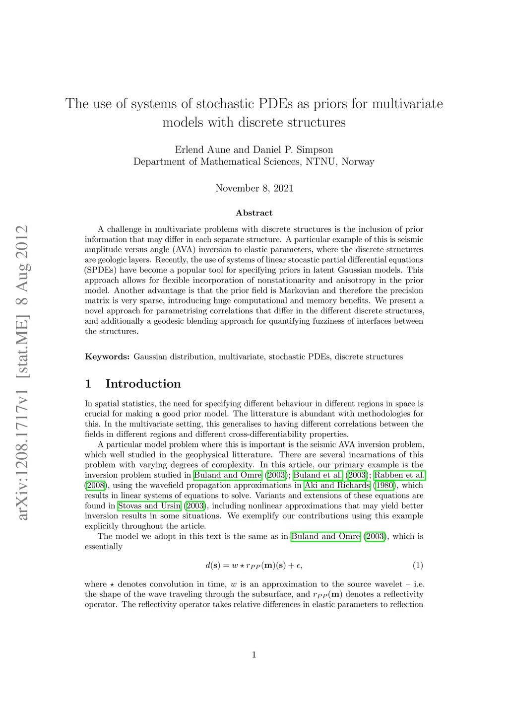 A challenge in multivariate problems with discrete structures is the inclusion of prior information that may differ in each separate structure. A particular example of this is seismic amplitude versus angle (AVA) inversion to elastic parameters, where the discrete structures are geologic layers. Recently, the use of systems of linear stocastic partial differential equations (SPDEs) have become a popular tool for specifying priors in latent Gaussian models. This approach allows for flexible incorporation of nonstationarity and anisotropy in the prior model. Another advantage is that the prior field is Markovian and therefore the precision matrix is very sparse, introducing huge computational and memory benefits. We present a novel approach for parametrising correlations that differ in the different discrete structures, and additionally a geodesic blending approach for quantifying fuzziness of interfaces between the structures. Keywords: Gaussian distribution, multivariate, stochastic PDEs, discrete structures