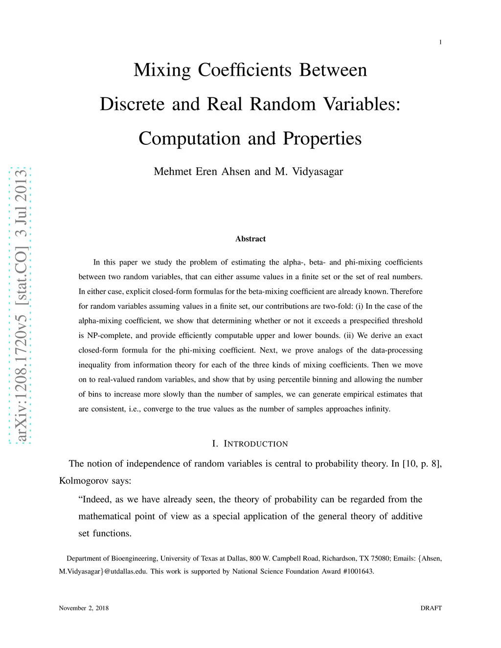 In this paper we study the problem of estimating the alpha-, beta- and phi-mixing coefficients between two random variables, that can either assume values in a finite set or the set of real numbers. In either case, explicit closed-form formulas for the beta-mixing coefficient are already known. Therefore for random variables assuming values in a finite set, our contributions are two-fold: (i) In the case of the alpha-mixing coefficient, we show that determining whether or not it exceeds a prespecified threshold is NP-complete, and provide efficiently computable upper and lower bounds. (ii) We derive an exact closed-form formula for the phi-mixing coefficient. Next, we prove analogs of the data-processing inequality from information theory for each of the three kinds of mixing coefficients. Then we move on to real-valued random variables, and show that by using percentile binning and allowing the number of bins to increase more slowly than the number of samples, we can generate empirical estimates that are consistent, i.e., converge to the true values as the number of samples approaches infinity.