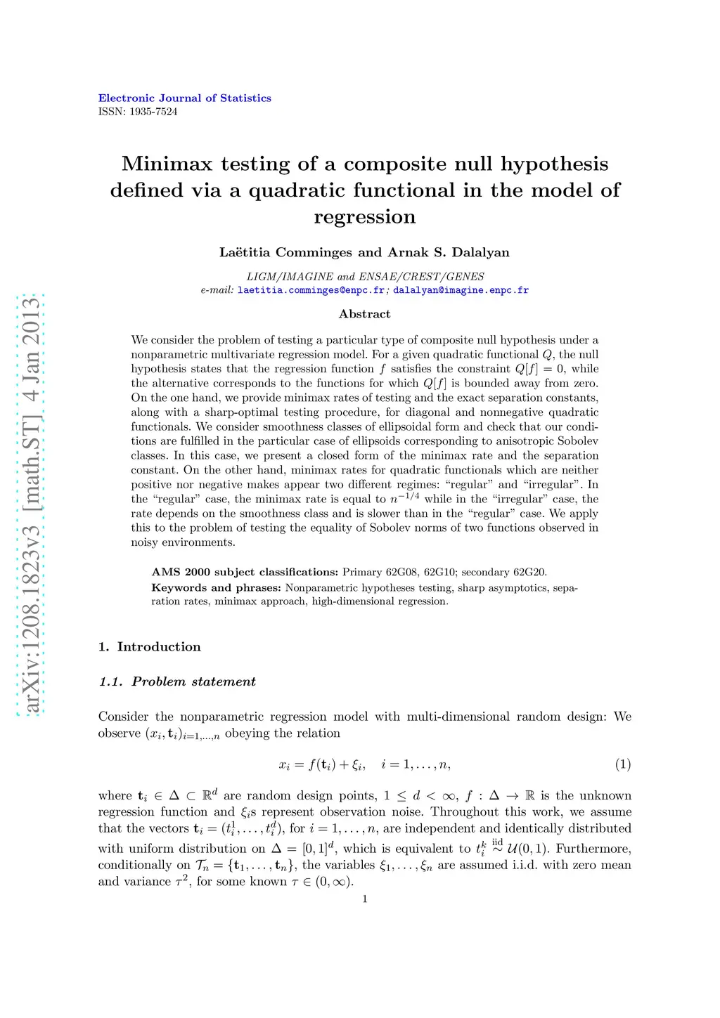 We consider the problem of testing a particular type of composite null hypothesis under a nonparametric multivariate regression model. For a given quadratic functional , the null hypothesis states that the regression function satisfies the constraint , while the alternative corresponds to the functions for which is bounded away from zero. On the one hand, we provide minimax rates of testing and the exact separation constants, along with a sharp-optimal testing procedure, for diagonal and nonnegative quadratic functionals. We consider smoothness classes of ellipsoidal form and check that our conditions are fulfilled in the particular case of ellipsoids corresponding to anisotropic Sobolev classes. In this case, we present a closed form of the minimax rate and the separation constant. On the other hand, minimax rates for quadratic functionals which are neither positive nor negative makes appear two different regimes: "regular" and "irregular". In the "regular" case, the minimax rate is equal to while in the "irregular" case, the rate depends on the smoothness class and is slower than in the "regular" case. We apply this to the issue of testing the equality of norms of two functions observed in noisy environments.