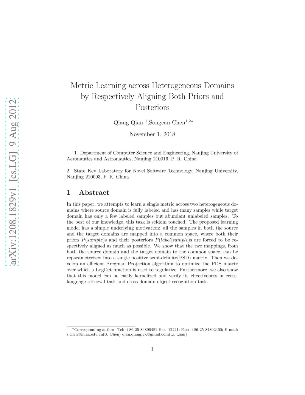 In this paper, we attempts to learn a single metric across two heterogeneous domains where source domain is fully labeled and has many samples while target domain has only a few labeled samples but abundant unlabeled samples. To the best of our knowledge, this task is seldom touched. The proposed learning model has a simple underlying motivation: all the samples in both the source and the target domains are mapped into a common space, where both their priors P(sample)s and their posteriors P(label|sample)s are forced to be respectively aligned as much as possible. We show that the two mappings, from both the source domain and the target domain to the common space, can be reparameterized into a single positive semi-definite(PSD) matrix. Then we develop an efficient Bregman Projection algorithm to optimize the PDS matrix over which a LogDet function is used to regularize. Furthermore, we also show that this model can be easily kernelized and verify its effectiveness in crosslanguage retrieval task and cross-domain object recognition task.