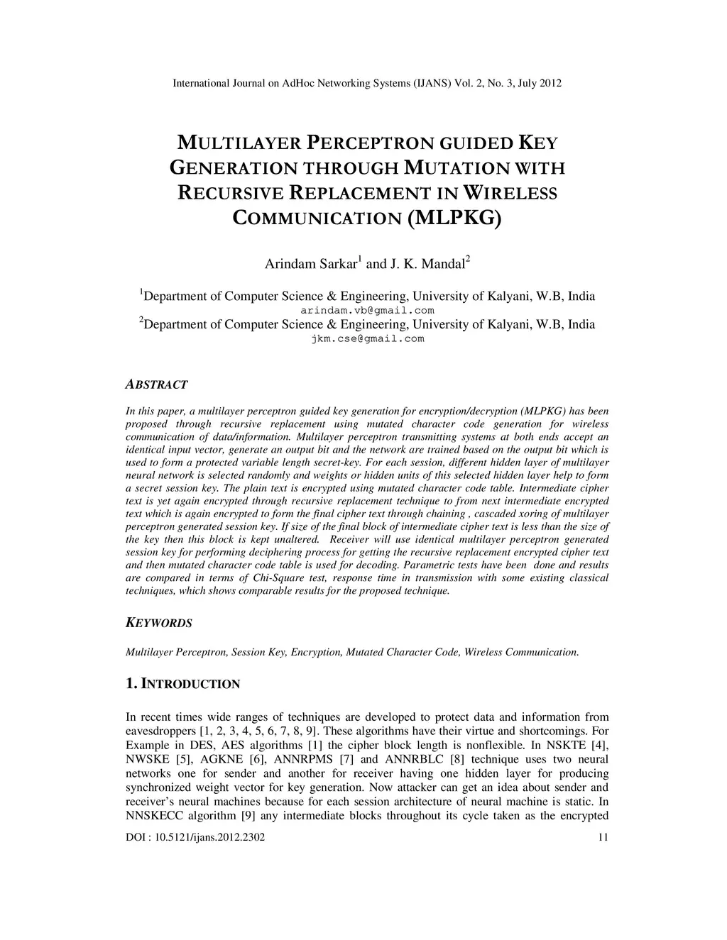 In this paper, a multilayer perceptron guided key generation for encryption/decryption (MLPKG) has been proposed through recursive replacement using mutated character code generation for wireless communication of data/information. Multilayer perceptron transmitting systems at both ends accept an identical input vector, generate an output bit and the network are trained based on the output bit which is used to form a protected variable length secret-key. For each session, different hidden layer of multilayer neural network is selected randomly and weights or hidden units of this selected hidden layer help to form a secret session key. The plain text is encrypted using mutated character code table. Intermediate cipher text is yet again encrypted through recursive replacement technique to from next intermediate encrypted text which is again encrypted to form the final cipher text through chaining, cascaded xoring of multilayer perceptron generated session key. If size of the final block of intermediate cipher text is less than the size of the key then this block is kept unaltered. Receiver will use identical multilayer perceptron generated session key for performing deciphering process for getting the recursive replacement encrypted cipher text and then mutated character code table is used for decoding. Parametric tests have been done and results are compared in terms of Chi-Square test, response time in transmission with some existing classical techniques, which shows comparable results for the proposed technique.
