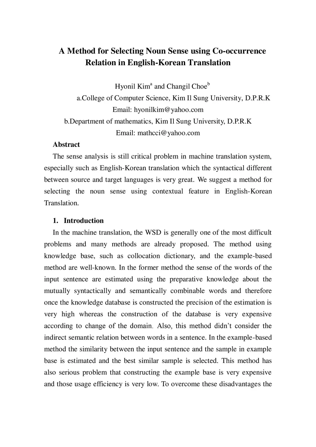 The sense analysis is still critical problem in machine translation system, especially such as English-Korean translation which the syntactical different between source and target languages is very great. We suggest a method for selecting the noun sense using contextual feature in English-Korean Translation.