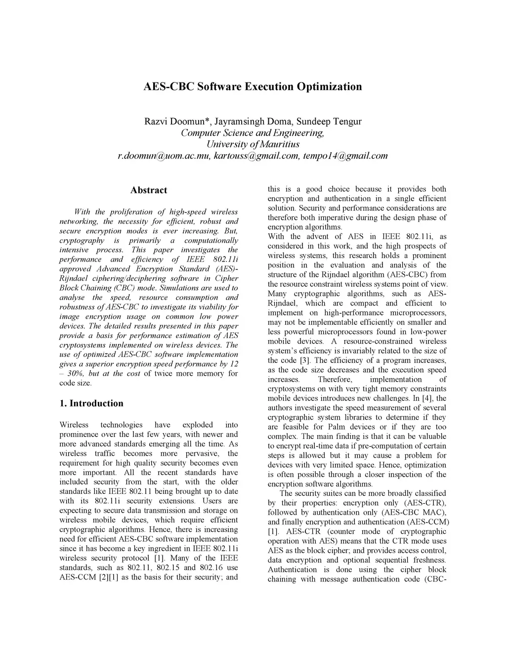 With the proliferation of high-speed wireless networking, the necessity for efficient, robust and secure encryption modes is ever increasing. But, cryptography is primarily a computationally intensive process. This paper investigates the performance and efficiency of IEEE 802.11i approved Advanced Encryption Standard (AES)-Rijndael ciphering/deciphering software in Cipher Block Chaining (CBC) mode. Simulations are used to analyse the speed, resource consumption and robustness of AES-CBC to investigate its viability for image encryption usage on common low power devices. The detailed results presented in this paper provide a basis for performance estimation of AES cryptosystems implemented on wireless devices. The use of optimized AES-CBC software implementation gives a superior encryption speed performance by 12 - 30%, but at the cost of twice more memory for code size.
