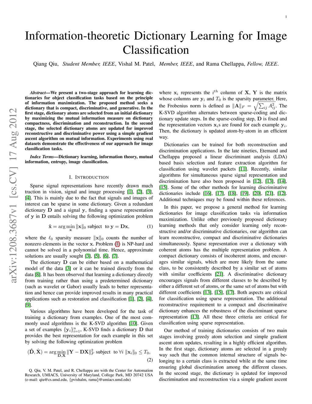 We present a two-stage approach for learning dictionaries for object classification tasks based on the principle of information maximization. The proposed method seeks a dictionary that is compact, discriminative, and generative. In the first stage, dictionary atoms are selected from an initial dictionary by maximizing the mutual information measure on dictionary compactness, discrimination and reconstruction. In the second stage, the selected dictionary atoms are updated for improved reconstructive and discriminative power using a simple gradient ascent algorithm on mutual information. Experiments using real datasets demonstrate the effectiveness of our approach for image classification tasks.
